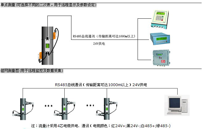 一次表與二次表(或計算機)之間采用RS-485總線通訊,采用普通電纜即可,傳輸距離可達1000米以上,組網十分方便、快捷。這種傳輸方式抗干擾能力強,解決了分體式超聲波流量計專用電纜成本高、抗干擾能力差、傳輸距離短等問題。