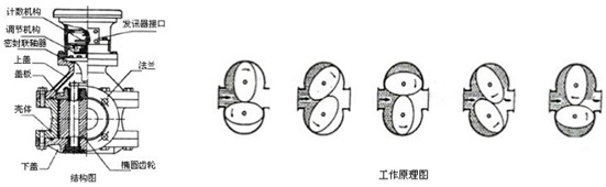 橢圓齒輪流量計由流量變送器和計數機構組成。變送器與計數機構之間加裝散熱器,則構成高溫型流量計。送變器由裝有一對橢圓齒輪轉子的計量室和密封聯軸器組成,計數機構則包含減速機構、調節機構、計數器、發訊器。計量室內由一對橢圓齒輪與蓋板構成初月形空腔作為流量的計量單位。橢圓齒輪靠流量計進出口壓力差推動而旋轉,從而不斷地將液體經初月形空腔計量后送到出口處,每轉流過的液體是初月形空腔的四倍,由密封聯軸器將橢圓齒輪轉的總數以及旋轉的快慢傳遞給計數機構或發訊器,便可知道通過管道中液體總量和瞬時流量。