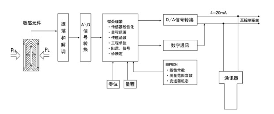 差壓變送器的核心是一個(gè)電容式傳感器,稱為“S”室。傳感器是一個(gè)完全密封的組件,過(guò)程壓力通過(guò)隔離膜片和灌充液硅油傳到傳感膜片引起位移。傳感膜片和兩電容極板之間的電容差由電子部件轉(zhuǎn)換成4~20mADC的二線制輸出的電信號(hào)。