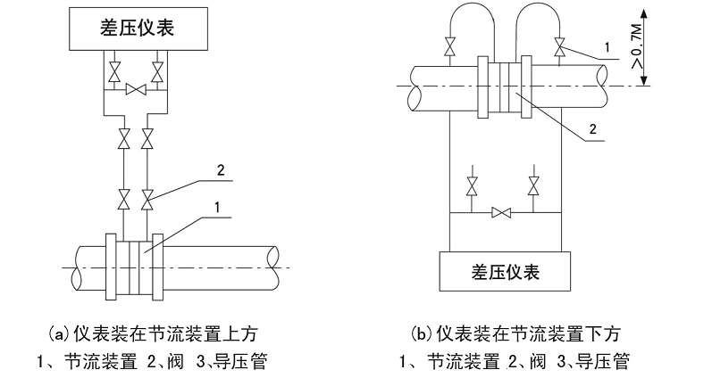 而引壓管線是指孔板流量計與差壓變送器(或差壓計)之間的導壓管路。它是孔板流量計的薄弱環節,安裝不好,容易造成堵塞、腐蝕、泄漏、凍結、假信號等等,約占全部故障率的70%,因此對差壓信號管路的配置和安裝應引起高度重視。根據被測介質和孔板節流裝置與差壓變送器(或差壓計)的相對位置,差壓信號管路有以下幾種安裝方式。