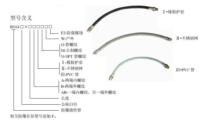 本防爆撓性管結構軟管兩端為金屬螺紋活接頭,管體部分分為金屬軟管,外層夾布優(yōu)質橡膠和增強尼布軟管護套以及夾層鋼絲編織網(wǎng)管三種形式組成。本產(chǎn)品具有耐燃、耐油、耐腐蝕、耐水、耐磨、耐老化、撓性良好、結構牢固、工作可靠等優(yōu)點。